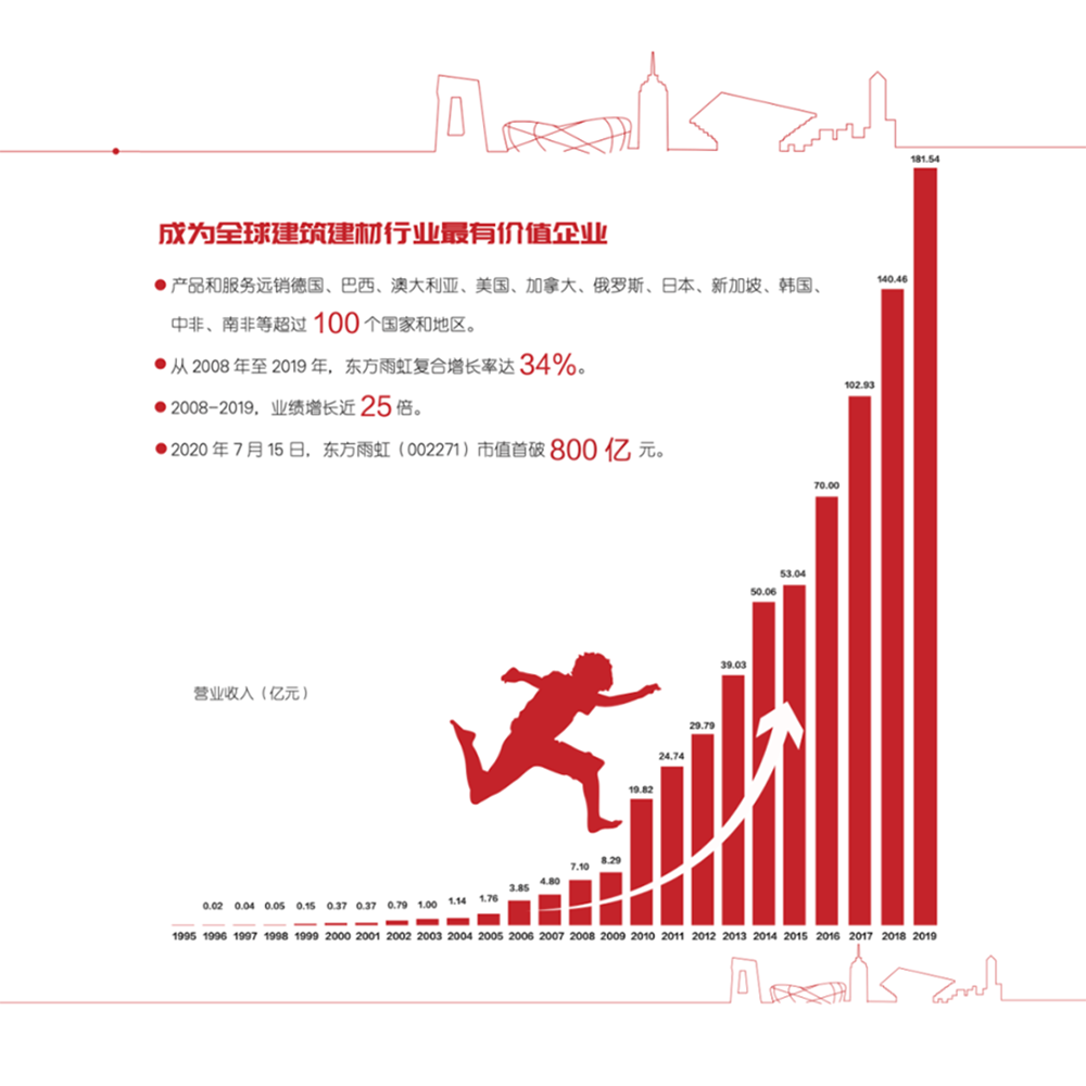东方雨虹(ORIENTAL YUHONG)致力于成为全球建筑建材行业最有价值企业,通过不断强化价值塑造,深耕科研技术,打造高端的产品、服务质量,稳固产品、技术等核心竞争力,在取得品牌信誉的同时,也形成了经营品质的持续提升。随着公司国际化进程的不断深入,东方雨虹(ORIENTAL YUHONG)将继续以客户为中心,坚守优秀品质,创造卓越价值,用实际行动推动行业、经济的可持续发展。